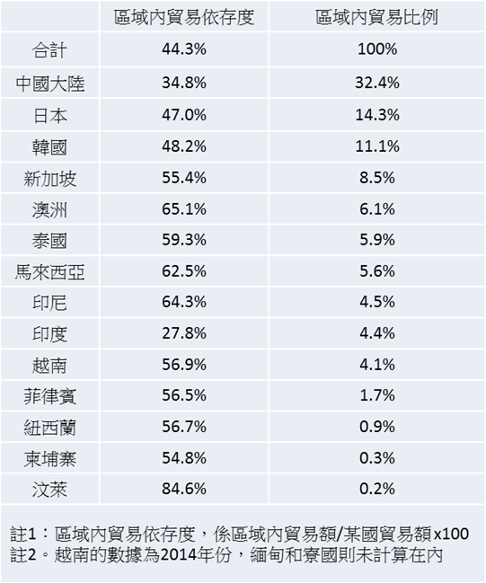 印度和中國大陸在區域內貿易依存度和區域內貿易比率都比其他RCEP成員國低得多。近幾年中國大陸已深化與東協的經貿關係,上述兩項比率也都在提高;但印度則未明顯改善,因此在參與RCEP貿易自由化談判過程態度始終消極。從歷次RCEP談判過程看,印度的態度並不明朗,去年初曾與中國大陸站在同一陣線,呼籲立即制定新興市場國家易於加入的RCEP協定。今年在印尼談判時則不滿其所提服務貿易內容遭修改。不過,RCEP方面已有不再等待印度而逕自向前走的準備。