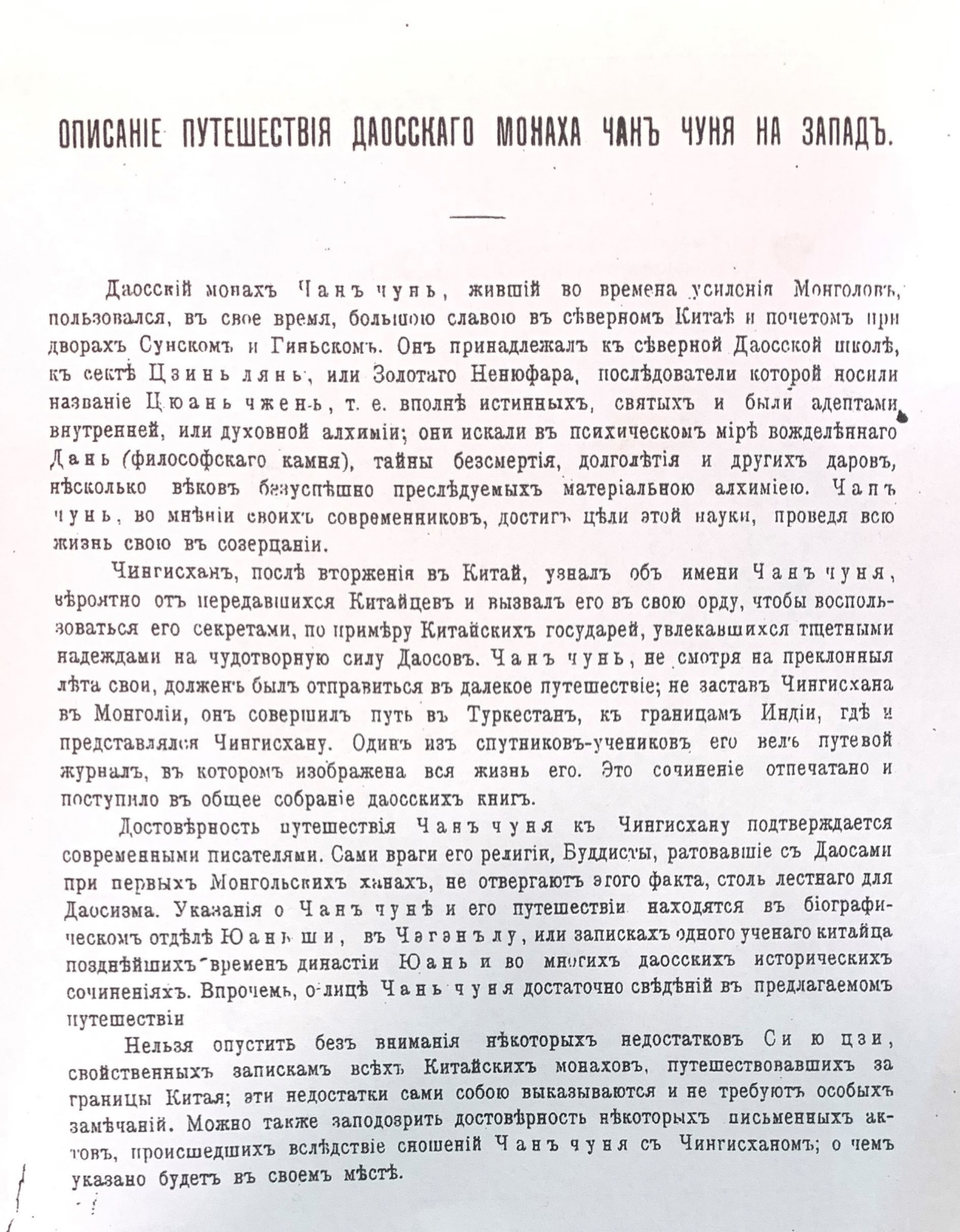 有關《長春道人西遊記》的論著,據我當時查訪莫斯科書肆及圖書館,僅僅在莫斯科大學近處(未及於俄羅斯其他城市),就有幾種版本。每發現一種版本,都令我有著「他鄉遇故知」般的激越情懷。但這背後也令我警惕到,邱處機及「雪山論道」一事廣為俄羅斯人知曉,但在台灣除了大圖書館一隅及少數書局外,一般不易找到該書的蹤影。其時在莫斯科所知的幾種版本中,以1866年及1910年兩版本最具代表性。前者係由俄羅斯歷史學者卡法羅瓦迻譯自在中國北平出版的中文版,並收錄在《俄羅斯宗教機構人員報告書》第六冊。數算起來,距今已有153年了。